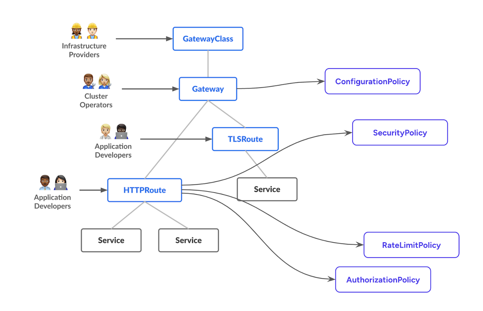 Platform Engineers / Administrators: Use GatewayClass and Gateway to define the overall gateway capabilities, such as load balancer parameters, TLS configurations, and other security and governance considerations.